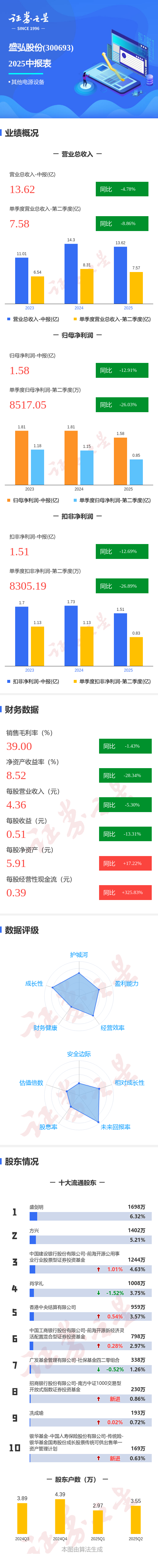 证券之星音尘,盛弘股份2025年中报披露,公司主营收入13.62亿元,同比下落4.79%;归母净利润1.58亿元,同比下落12.91%;扣非净利润1.51亿元,同比下落12.7%;其中2025年第二季度,公司单季度主营收入7.58亿元,同比下落8.87%;单季度归母净利润8517.05万元,同比下落26.04%;单季度扣非净利润8305.19万元,同比下落26.9%;欠债率50.12%,投资收益0.0万元,财务用度-439.41万元,毛利率39.0%。 财报数据节录请见下图: ![]() ![]() |