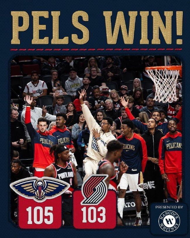 鹈鹕(2-0):霍金斯24分5篮板、英格拉姆21分8篮板4助攻、麦科勒姆20分3助攻4抢断、锡安16分11篮板7助攻4盖帽
