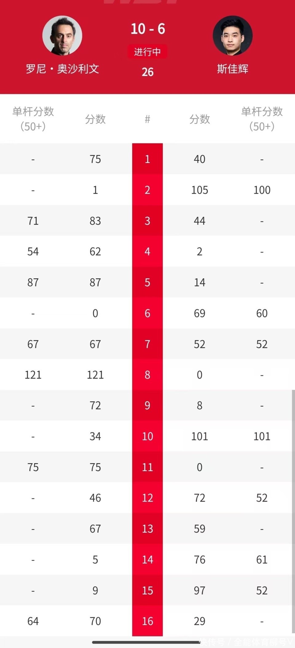 与黑马沃拉斯顿的这场比赛,斯佳辉以13-10晋级何况。1/4决赛,斯佳辉挑战七届世锦赛冠军“火箭”奥沙利文。比赛中,斯佳辉打得相配武断,第一阶段以2-6过期,第二阶段以6-10过期,尽管如斯,斯佳辉的阐扬如故可圈可点,在与奥沙利文对攻,轰出了两杆破百也很精彩。接下来,期待他的大逆转!